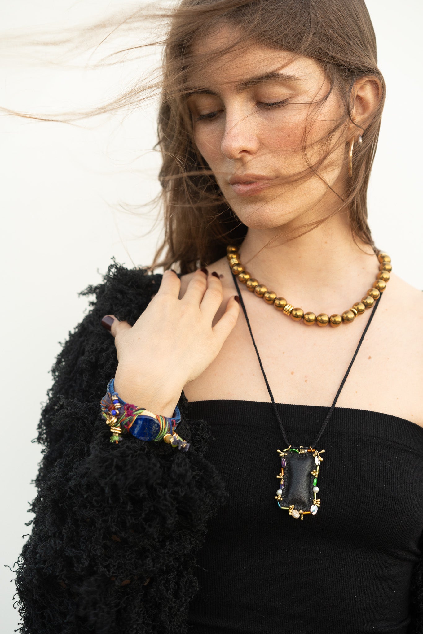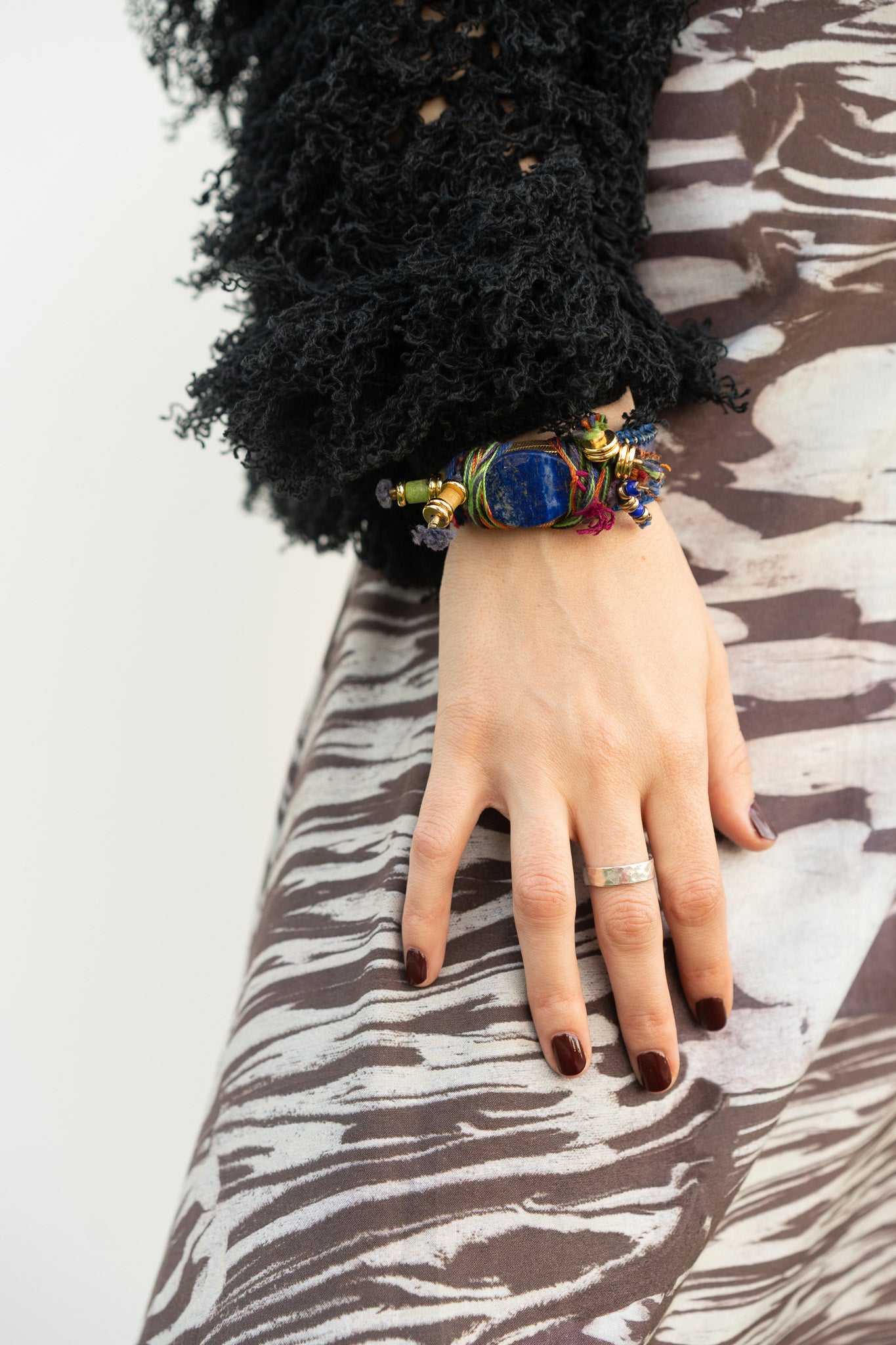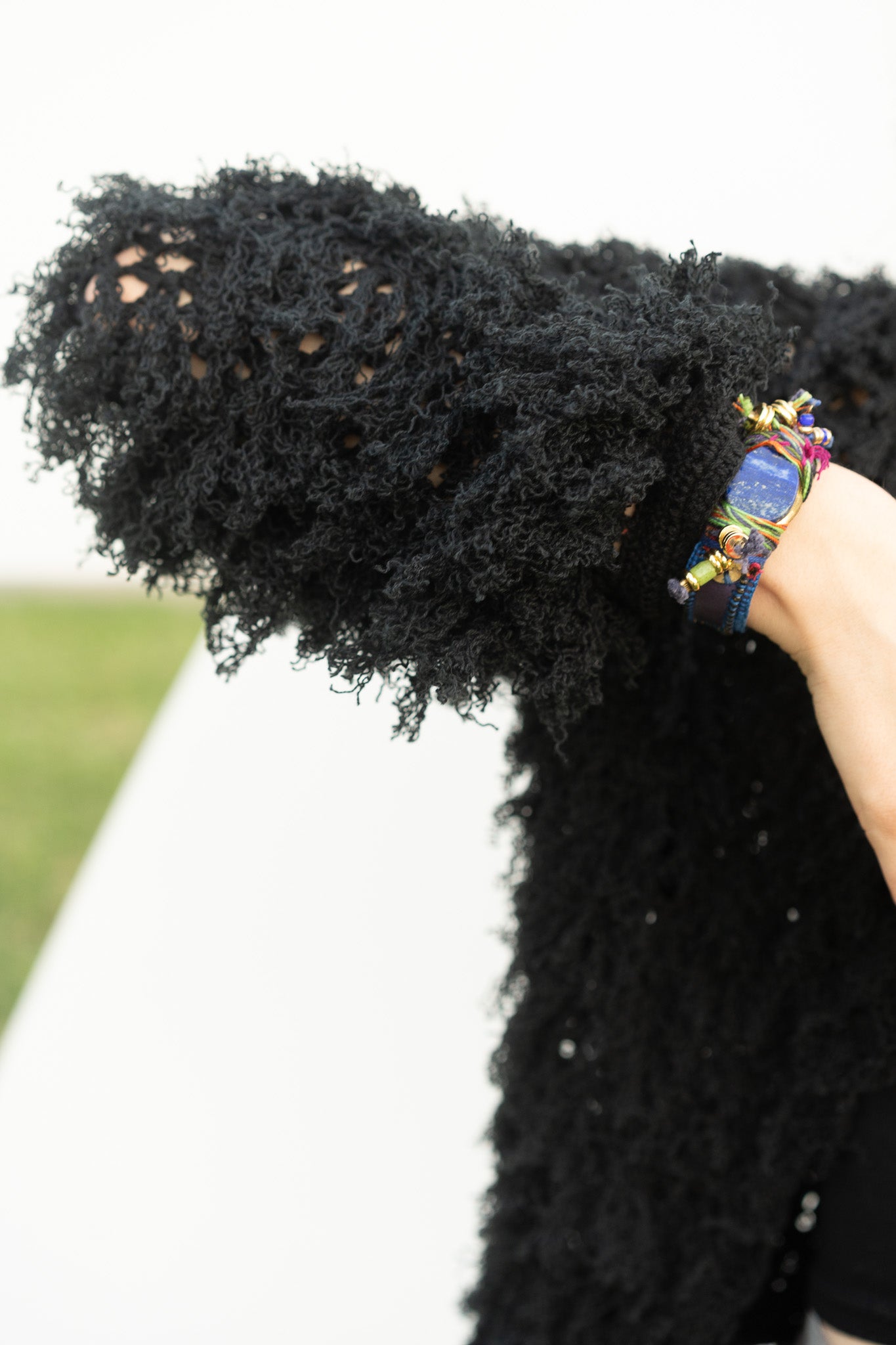 Each sleeve hums with texture, fibers that shift with air and light, soft chaos arranged just so. Classic black, goes with anything, lush enough to feel warmth like a winter coat. Great with a dress but also fun with jeans.