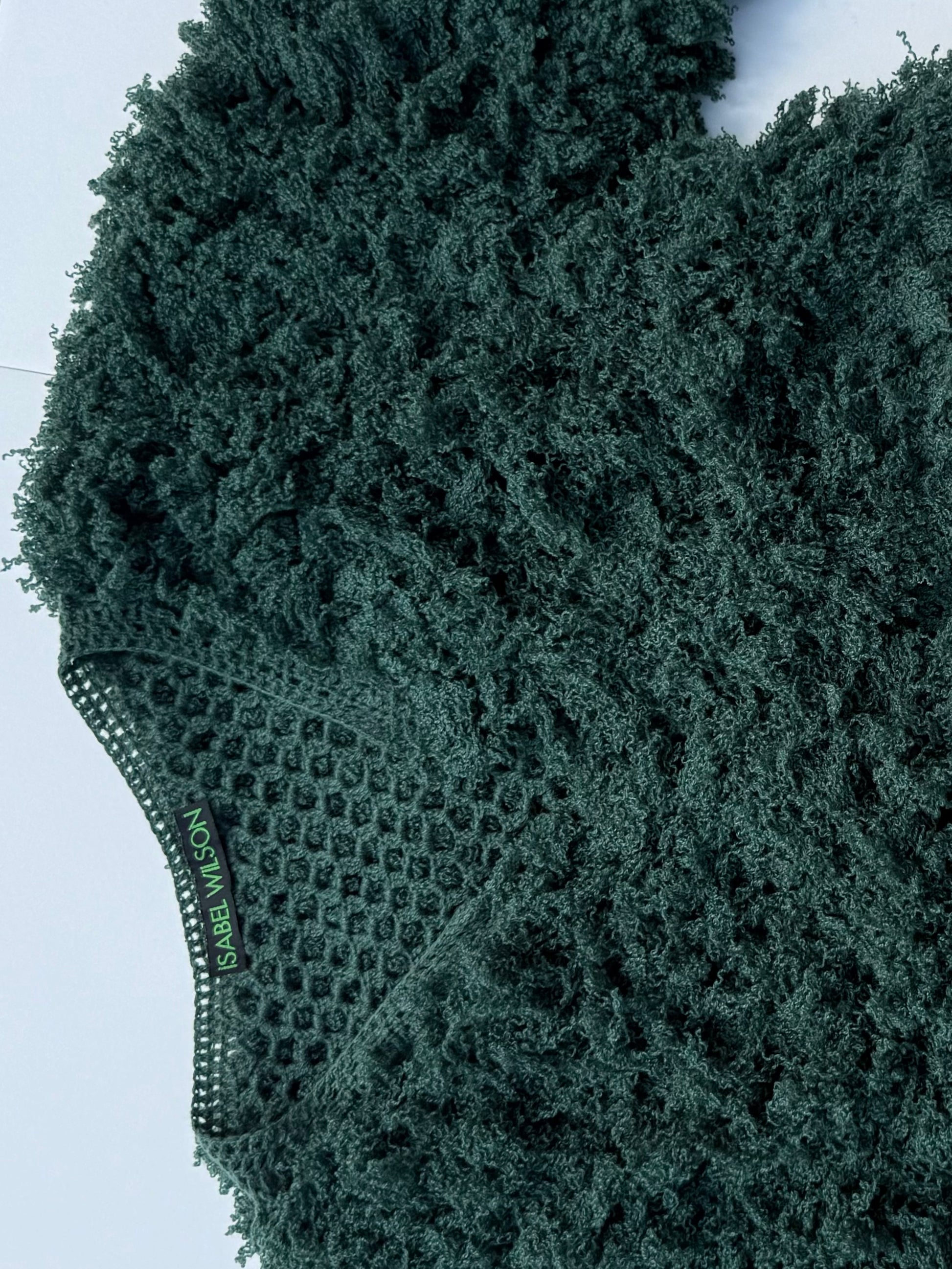 Each sleeve hums with texture, fibers that shift with air and light, soft chaos arranged just so. A deep emerald tone that lands somewhere between moss and night, lush enough to feel warmth like a winter coat.